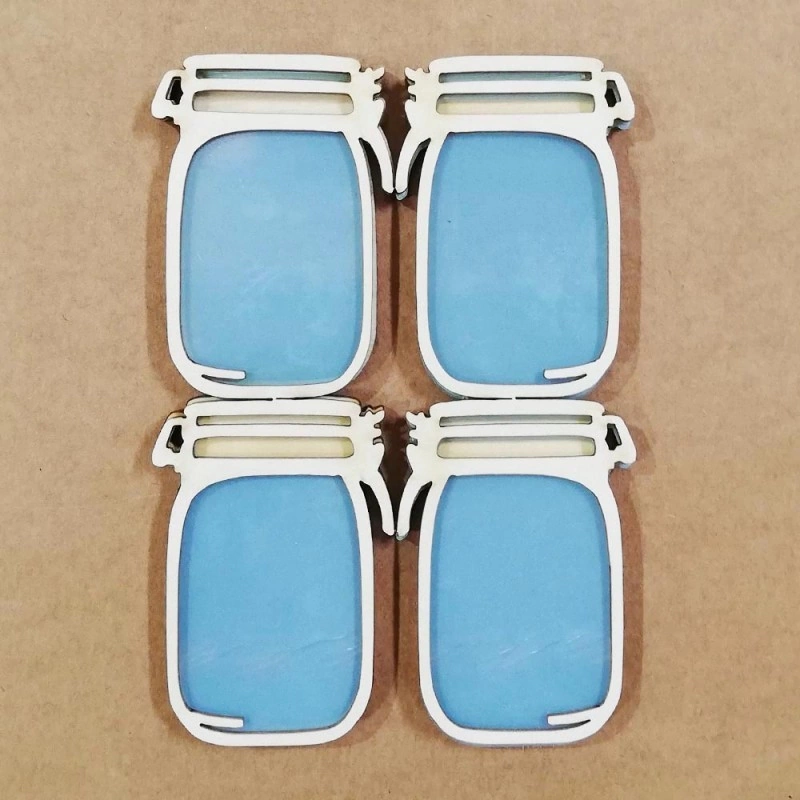 4 shakers em forma de potes 6 x 4 cm. É composto por 3 peças: madeira de 4 mm + acetato de 0,5 mm. + aglomerado de 1,5 mm.